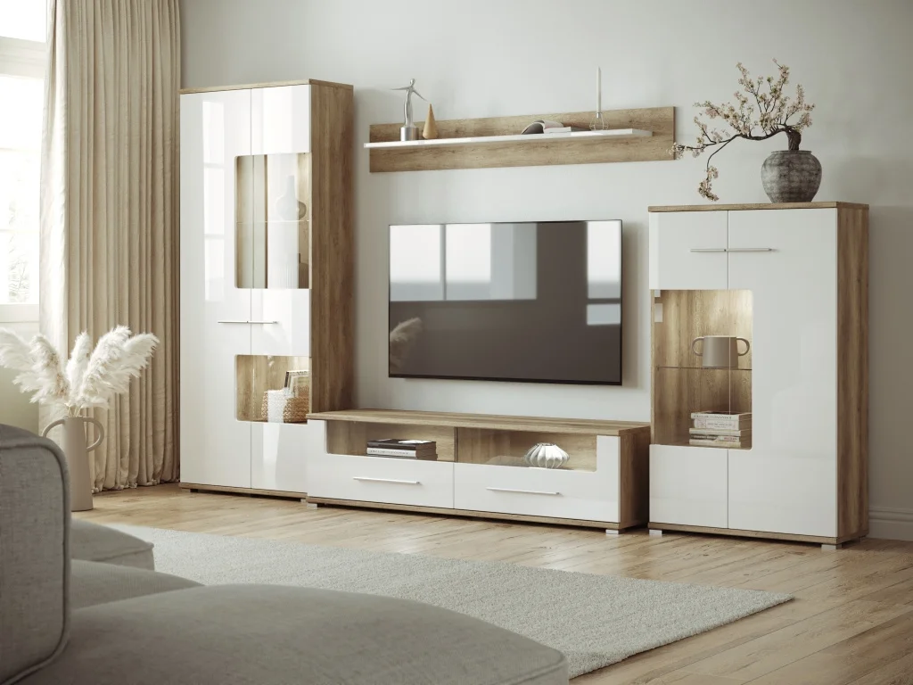 Rozměry činí 310 × 195 × 47 cm a stěnu dodáváme v demontu pro snadnou montáž. LED osvětlení vytváří jemný ambientní světelný efekt, který zvyšuje komfort sledování televize a dělá obývací pokoj útulnějším. Využití stěny zahrnuje prostor pro televizi, médium a dekorace, díky čemuž získáte praktický i stylový prostor pro váš domov.