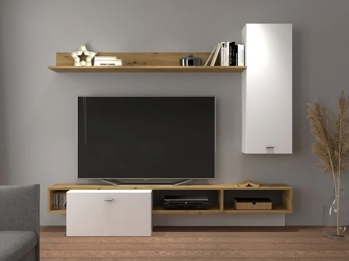 Představujeme obývací stěnu REIMA v elegantní kombinaci dub artisan a bílé, která doplní každý moderní interiér. Rozměry 225 x 206 x 44,8 cm poskytují dostatek prostoru pro TV, dekorace i úložné skříně.