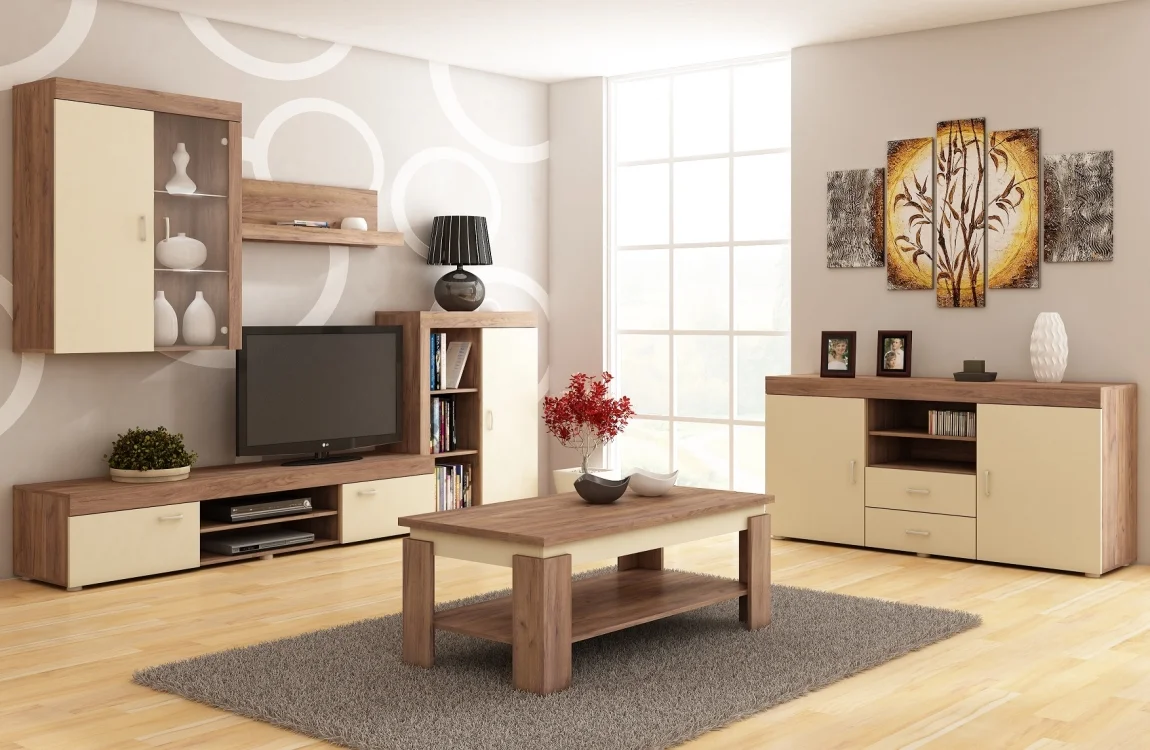 Obývací stěna SIWANI v barevném provedení craft tobaco/krém přináší elegantní a nadčasový dojem do obývacího prostoru. Obsah balení zahrnuje TV stolek o rozměrech 200 x 39 x 47 cm, nízký regál 90 x 114 x 37 cm, závěsnou skříňku 90 x 111 x 37 cm a police 110 x 30 x 22 cm.