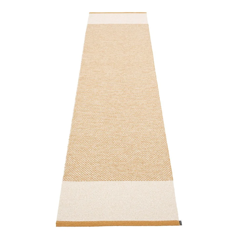 Okrově žlutý běhoun od značky Pappelina přináší do vašeho prostoru harmonii přírodních tónů a moderního designu. Tento elegantní koberec je vyroben z kvalitního švédského PVC bez ftalátů, což zaručuje jeho dlouhou životnost a odolnost vůči opotřebení. Díky tradiční technice tkaní je produkt nejen vizuálně atraktivní, ale také praktický, protože je možné jej snadno čistit ručně nebo v pračce na 30 °C. Ideální je pro použití jak uvnitř, tak i venku, a díky jeho odolnosti si zachová svůj vzhled i při každodenním používání. Tento běhoun je skvělou volbou pro ty, kteří hledají spojení funkčnosti, stylu a inovace.