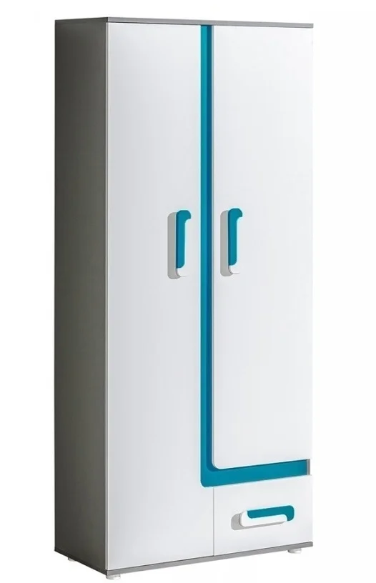 Korpus je v barvě antracit, dveře v matné bílé a doplňky v tyrkysové, přičemž úchytky jsou sladěny tyrkys/bílá. Uvnitř najdete police a ve spodní části praktickou zásuvku pro ukládání oblečení a drobností. LTD desky s ABS hranou zaručují odolnost a snadnou údržbu. Díky modulárnímu systému ORAKI III můžete sestavit pokoj podle svých potřeb a přání a snadno rozšiřovat o další prvky. Rozměry: výška 192 cm, šířka 85 cm, hloubka 40 cm. Dodáváno v demontu. Záruka 24 měsíců.