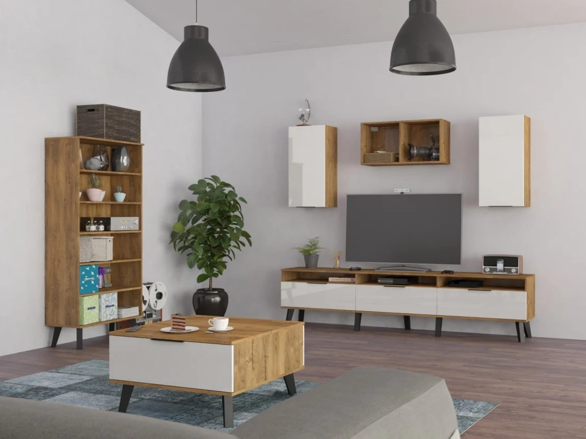 OSMAK 5 je modulární systém obývacího nábytku, který si jednoduše poskládáte podle prostoru a vkusu. Uvedená sestava slouží jako ilustrativní příklad jedné z možností; jednotlivé díly lze pořídit samostatně. Příkladem jsou regál 80 x 174 x 38 cm, konferenční stolek 80 x 46 x 84 cm, dvě závěsné skříňky 1DPN 40 x 80 x 32 cm, závěsná police 40(80) x 80(40) x 28 cm a televizní stolek 240 x 57 x 40 cm. Barva kombinuje dub burgundský a bílý lesk, nožky mají výšku 18 cm. Nástavba je vyrobena z lamina tloušťky 16 mm s ABS hranami a doplňují ji dřevěné nožky. Dvířka i zásuvky jsou vybaveny tlumeným dovíráním, což zajišťuje klidný chod nábytku. Dodáváno v demontu a se zárukou 5 let. Díky své modulární povaze lze OSMAK 5 snadno přizpůsobit velikosti místnosti a vašim estetickým požadavkům, čímž získáte praktické i stylové řešení pro váš domov.
