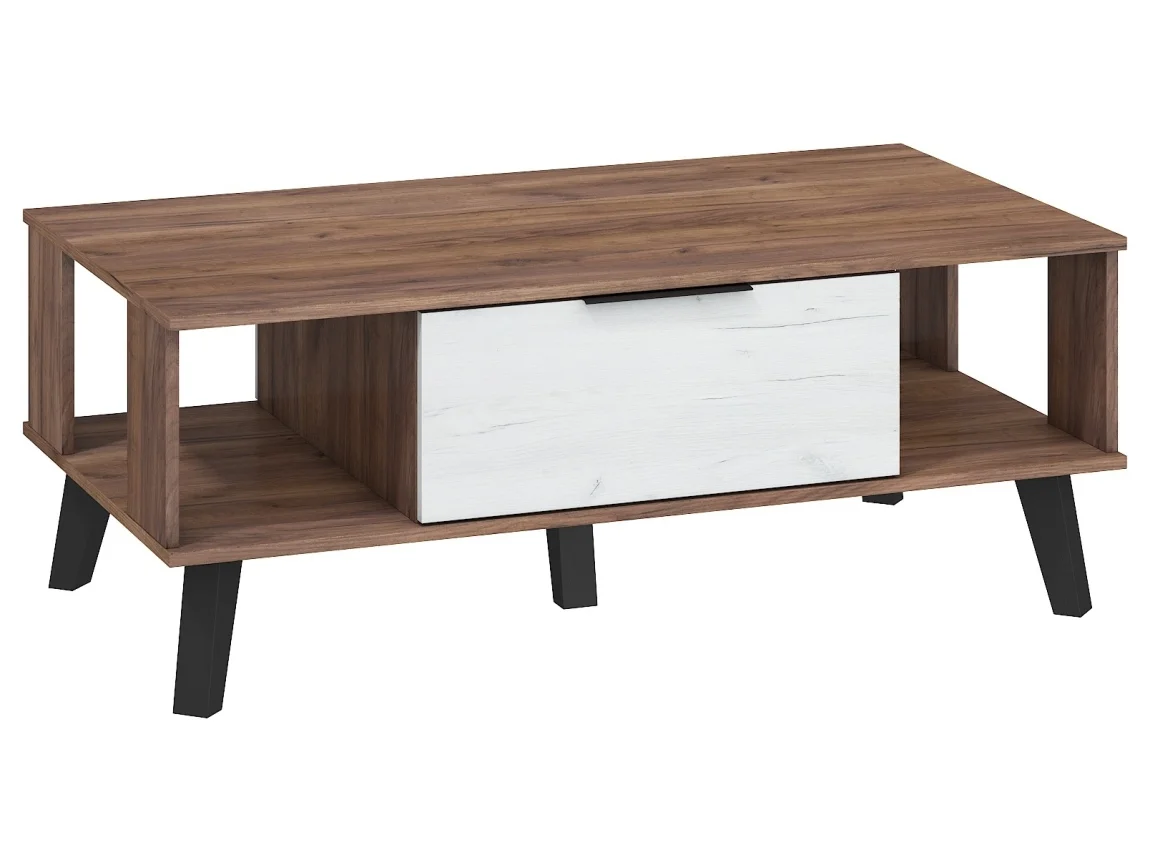 OSMAK představuje velký konferenční stolek s výklopnými dvířky a bočními skříňkami pro praktické ukládání věcí. Deska je z 16 mm laminátu s ABS hranami a stolík stojí na černých dřevěných nohách, které dodávají moderní kontrast.
