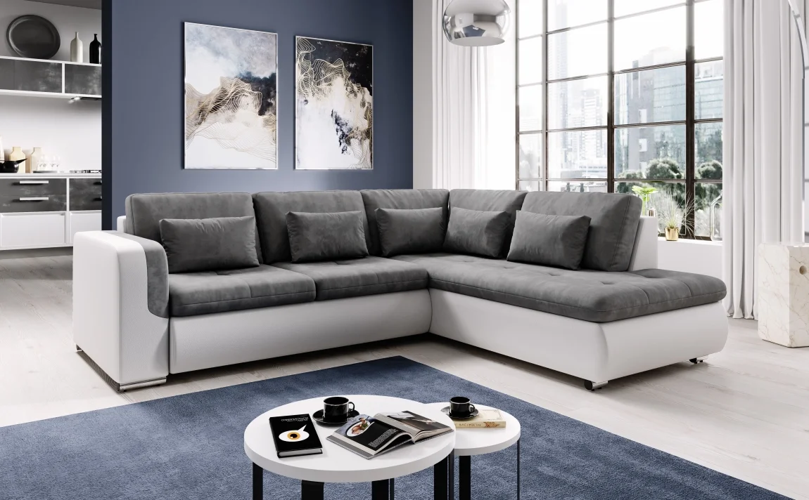 Pravá rohová sedačka rozkládací PARDUS L spojuje styl s praktičností a nabízí pohodlné sezení i prostorné lůžko. Potahová kombinace zahrnuje tmavě šedou látku Kronos 34 a bílou ekokůži Madryt 120, čímž vzniká elegantní dvoubarevný vzhled.