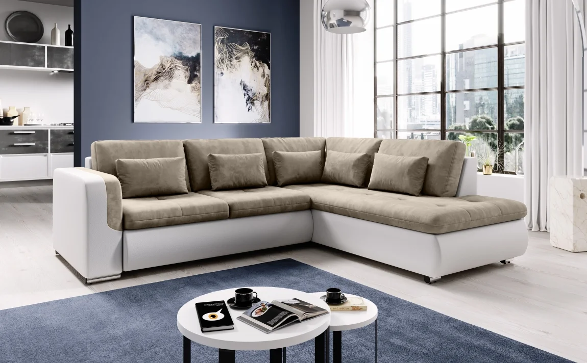 Rozkládací rohová sedačka PARDUS L s pravou orientací kombinuje béžovou látku Paros 03 a bílou ekokožu Madryt 120, čím vytváří nadčasový kontrast pro váš interiér. Sedačka je celočalouněná, což zajišťuje jednotný vzhled a snadnou údržbu.