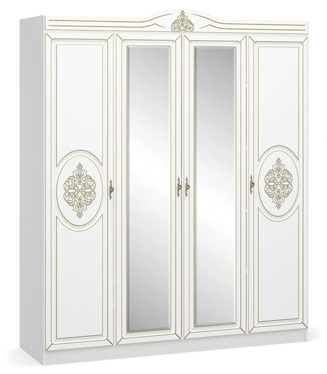 Praktická čtyřdveřová šatní skříň s vestavěným zrcadlem nabízí dostatek úložného prostoru díky šatní tyči a deseti policím. Přední část je vyrobena z kvalitní MDF desky, zatímco korpus tvoří odolná LTD deska, což zajišťuje stabilitu a dlouhou životnost.