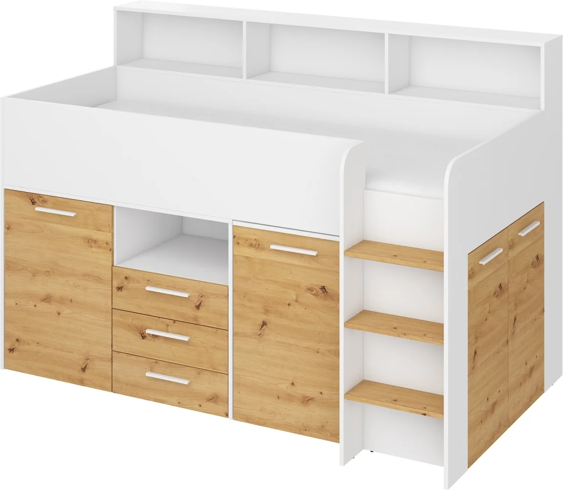 Kompaktní patrová postel DAGOBERT s pravým schodištěm je ideálním řešením pro malé pokoje. Nabízí pohodlné lůžko a zároveň úložný prostor, aniž by zabírala cenné místo. Vysouvací psací stůl je praktickým doplňkem pro školáka a po práci se jednoduše zasune pod postel, takže prostor zůstává volný pro hraní. Matrace není součástí; doporučená ložná plocha je 80x200 cm a maximální výška matrace 12 cm. Součástí lůžka je pevná deska, rošt tedy není potřeba. Rozměry: 206 x 138 x 120 cm; ložná plocha 80x200 cm; nosnost až 90 kg. Materiál: lamino 16 mm s ABS hranami; úchytky z tvrzeného plastu. Barva provedení: bílá/dub artisan; úchytky stříbrné. Dodáváno v demontu. Záruka 5 let. A díky nadčasovému designu se postel hodí jak do dětského, tak do studentského pokoje a dlouhodobě vydrží.