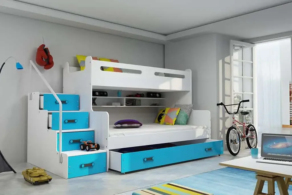 Postel pojme až tři děti a díky chytrým úložným prostorům šetří místo: spodní výsuvná část a široké schůdky vedoucí na horní lůžko skrývají praktické úložné kapsy. Schůdky jsou dostatečně široké a opatřené zábranou, takže pohyb po nich je bezpečný a horní bok postele je zvýšený pro další jistotu bezpečného užívání.