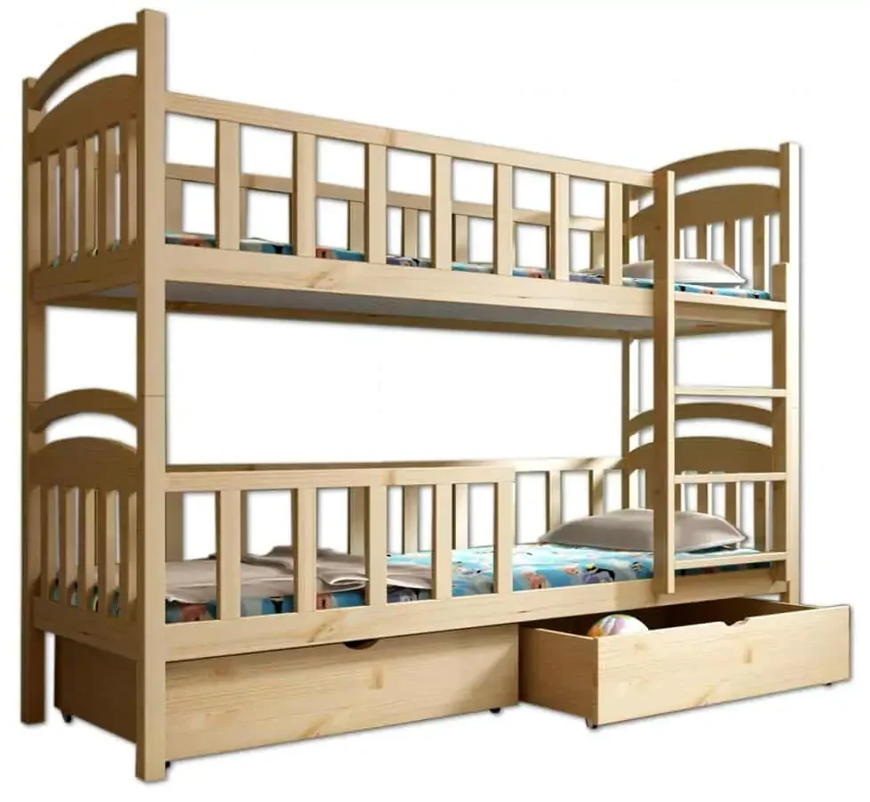 Patrová postel Vomaks PP 007 je díky robustní konstrukci z masiv borovice a odolným DTD lamino ideálním řešením pro sdílený pokoj s úložným prostorem. Úložné prostory mají čela z masivní borovice a korpusy z DTD lamino; při objednání v surovém stavu je dodávána celodřevěná varianta, pro barevné provedení bývá korpus bílý. Postel má 11 lamel v roštu, což zajišťuje pevnou oporu matrace. Pokud je na vizualizaci zobrazena zábrana, je součástí postele; matrace ani textilní doplňky nejsou součástí balení. Materiál zahrnuje 26 mm tloušťku borovice, bukové kolíky, kovové spoje a DTD lamino; barvy AKRYCOL COLORLAK jsou určeny pro dětský nábytek. Rozměry se volí podle vybrané varianty a k nim se přičítá 6,5 cm; výška, šířka a délka se tedy odvíjejí od volby varianty. Výběr matrace: skutečný rozměr matrace odpovídá vybrané variantě. Příklad: varianta 80 x 180 cm vyžaduje matraci 80 x 180 cm; pokud zvolíte postel s přistýlkou, rozměr matrace určuje vrchní ložná plocha a matrace do přistýlky bývá vždy o 10 cm kratší v délce, tedy 80 x 170 cm. Zboží je dodáváno v demontu. A pro lepší využití prostoru v dětském pokoji nabízí tato patrová postel praktické úložné prostory a stabilní konstrukci, která vydrží každodenní provoz.