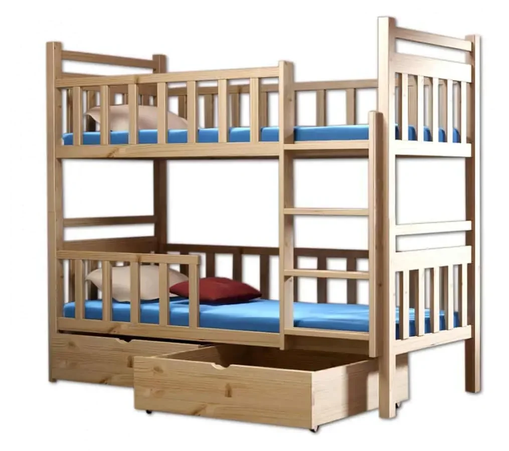 Patrová postel s variabilními rozměry, která se přizpůsobí prostoru díky volbě šířky a délky v rámci variant s doplňkem 6,5 cm. Úložné prostory jsou řešeny čely z masiv borovice a korpusy z DTD lamina; při objednání v surovém stavu bývají dodávány jako plně dřevěné, pro barevná provedení pak s bílými korpusy. Počet lamel v roštu činí 11 na každé lůžko a pokud je na obrázku zábrana, je součástí postele. Matraci a textilní doplňky nelze v balení očekávat.