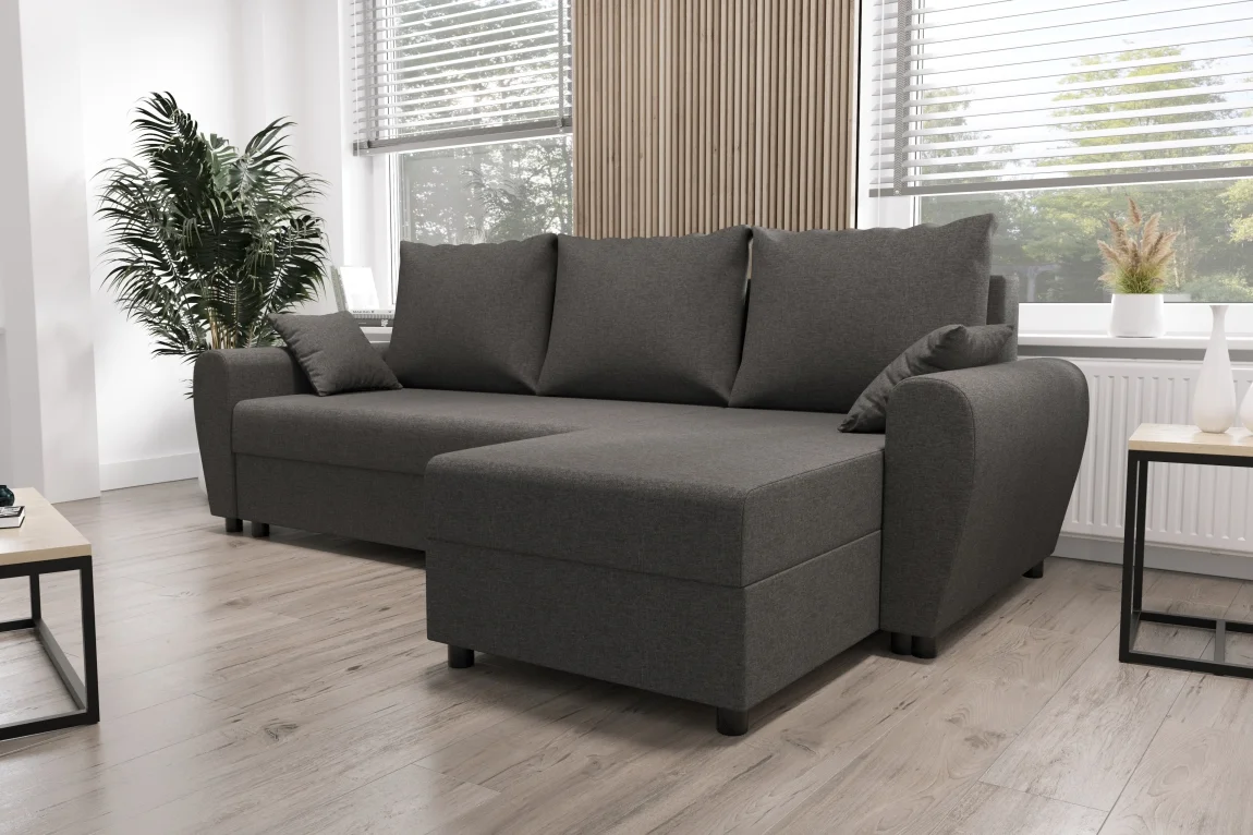 Rohová sedačka PERKSUM v tmavě šedé barvě Sawana 05 je praktické a flexibilní řešení pro váš obývací prostor. Díky možnosti montáže rohu na pravou i levou stranu ji snadno přizpůsobíte uspořádání místnosti.
