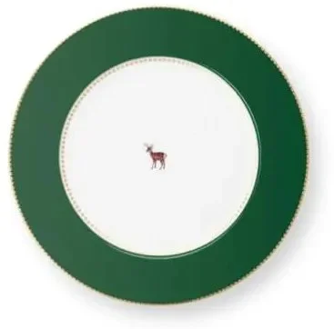 Elegantní talíř z kolekce Love Birds od Pip Studio přináší jedinečný design, který okouzlí každou hostinu. Na jeho tmavě zeleném podkladu vyniká jemný zlatý okraj a dominantní motiv roztomilého jelínka uprostřed, což dodává stolování nádech luxusu a hravosti. Tento porcelánový talíř je ideální pro servírování hlavních jídel a skvěle se hodí k dalším kusům z této kolekce, čímž vytvoříte harmonickou a stylovou tabuli. Vyrobený ze 100% kvalitního porcelánu je nejen krásný, ale také odolný, avšak je důležité poznamenat, že jej nelze mýt v myčce ani používat v mikrovlnné troubě, což prodlužuje jeho životnost. Tento talíř je perfektní volbou pro milovníky designu a originálního stolování, kteří ocení každý detail své tabule.