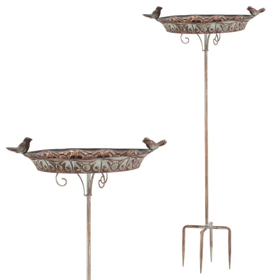 Kovová mísa na pítko se vysokým zápichem (přibližně 90 cm) tvoří elegantní a praktickou ozdobu vaší zahrady. Na okraji ji zdobí dva pěvci a měděná barva dodává nadčasový vzhled. Mísa může sloužit jako krmítko pro ptáky nebo jako základ pro zahradní aranžování. Jde o stylový doplněk, který vaši zahradu oživí a zároveň poskytne užitek. Díky pevné konstrukci a povrchové úpravě je odolná vůči počasí a snadno se udržuje — stačí doplnit vodu či krmivo a občas ji očistit.
