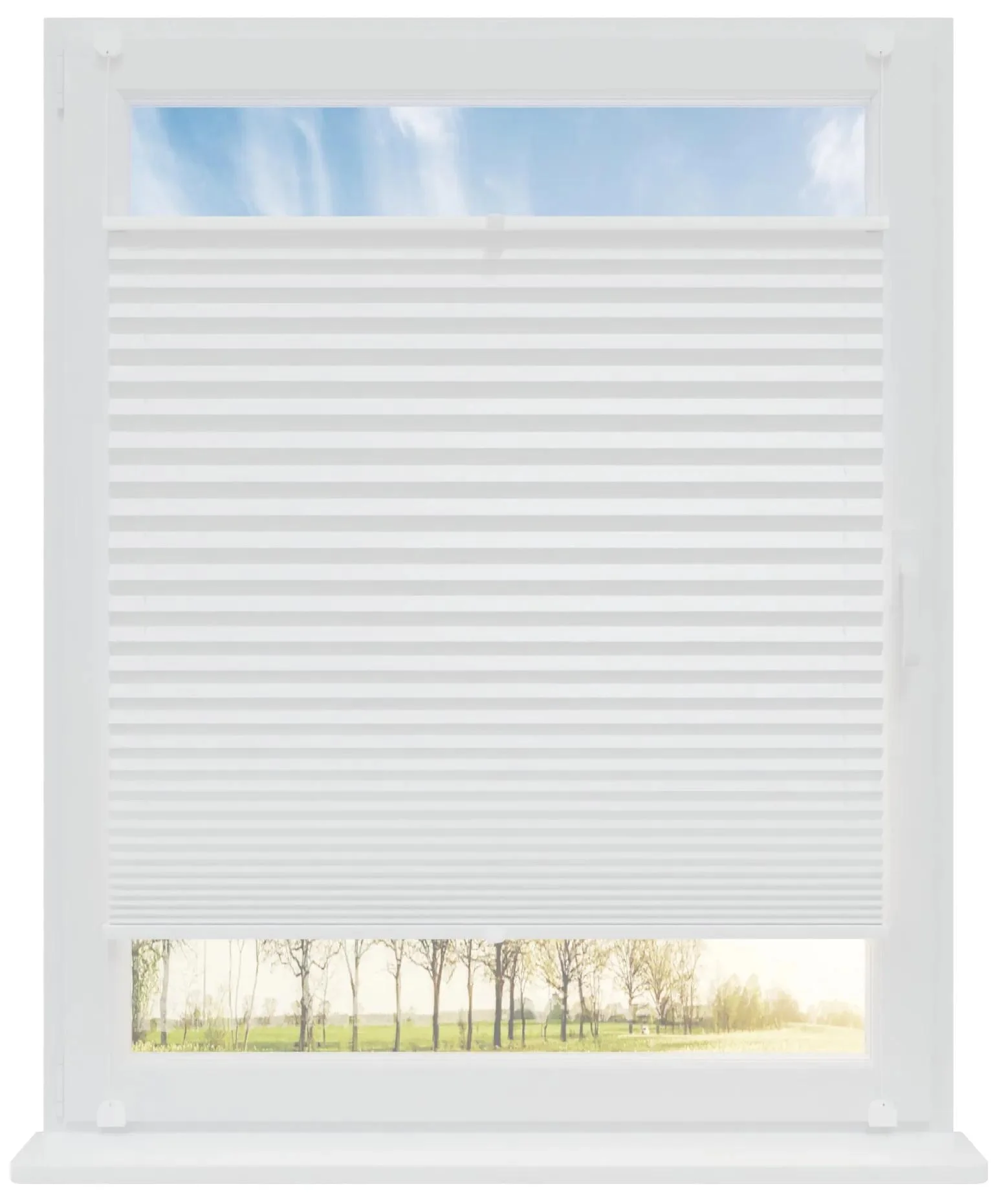 Elegantní a funkční plisovaná rolety v klasickém bílém odstínu, ideální pro jednoduché a moderní dekorace oken. Tento model nabízí dokonalou ochranu před slunečním zářením bez úplného zatemnění místnosti, přičemž umožňuje plynulé nastavení výšky podle potřeby.
