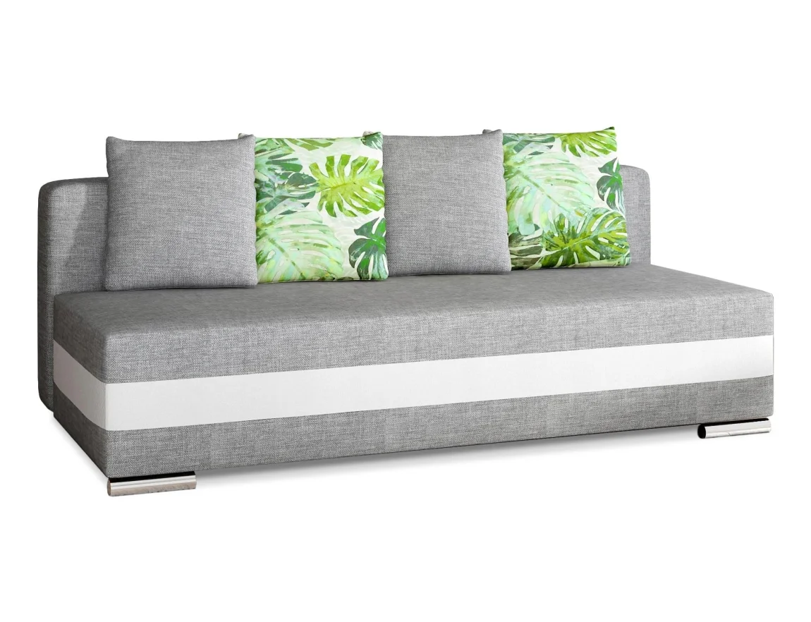 Pohovka ANDEM je stylová rozkládací sedačka s praktickým úložným prostorem, která nabídne pohodlí pro denní sezení i spací plochu pro hosty. Pro potahy jsou k dispozici dvě varianty: látka Sawana 21 v světlé šedé a bílá ekokůže Soft 17; polštáře jsou potaženy Sawana 21 a Jungle 32 s listovým vzorem.