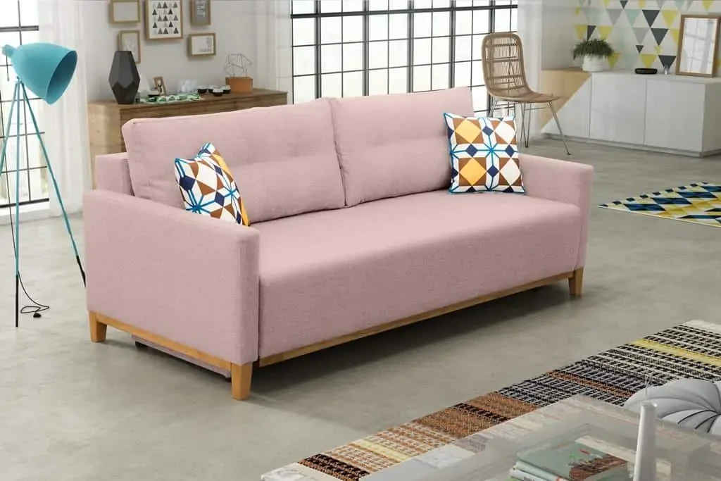 Pohovka Aristo v jemně růžové barvě svým skandinávským vzhledem představuje spojení minimalistického stylu a praktických funkcí. Rozkládací pohovka s úložným prostorem nabízí pohodlné sezení a snadno se mění na lůžko pro občasné přespání hostů. Díky automatickému mechanismu zvládnete rozložení jednou rukou a bez námahy. Součástí je i úložný prostor pro lůžkoviny a sezónní doplňky. Komfort zvyšuje výplň sedáku složená z bonellových pružin a kvalitní PUR pěny; odnímatelné opěrné polštáře můžete libovolně nastavit. V ceně jsou dvě malé vzorované polštářky dle fotografie; ostatní dekorace a doplňky na doprovodných snímcích nejsou součástí. Upozornění: úprava moření dřeva není možná a skutečná látka dodání vychází ze vzorku z doplňkových fotografií; úvodní snímek je ilustrační.