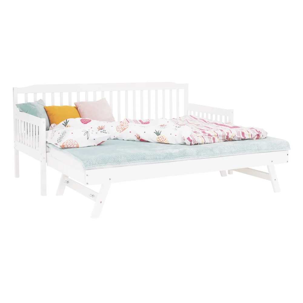 Elegantní pohovka s přistýlkou KUNHUTA v bílé povrchové úpravě je praktickým řešením do dětského pokoje i menších bytů. Díky jednoduchému mechanismu se bez námahy promění v pohodlné lůžko s přistýlkou, která má kolečka pro snadnou manipulaci a po rozložení se opře o stabilní nohy.