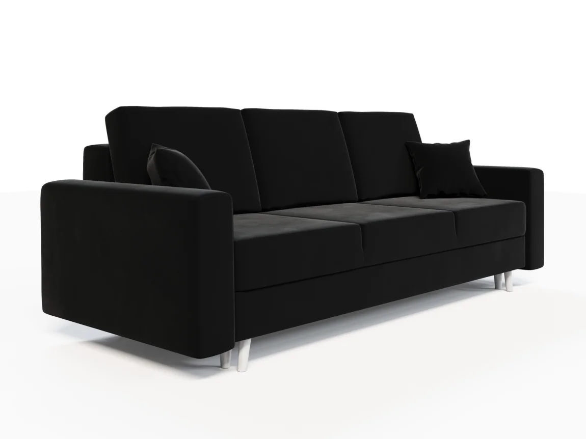 Rozkládací pohovka Loyola v černé barvě má potah z plyš Itaka 15, který dodává útulný vzhled i příjemný dotyk. Rozměry jsou 230 × 90 × 87 cm (d x š x v) a sedací výška činí 45 cm.