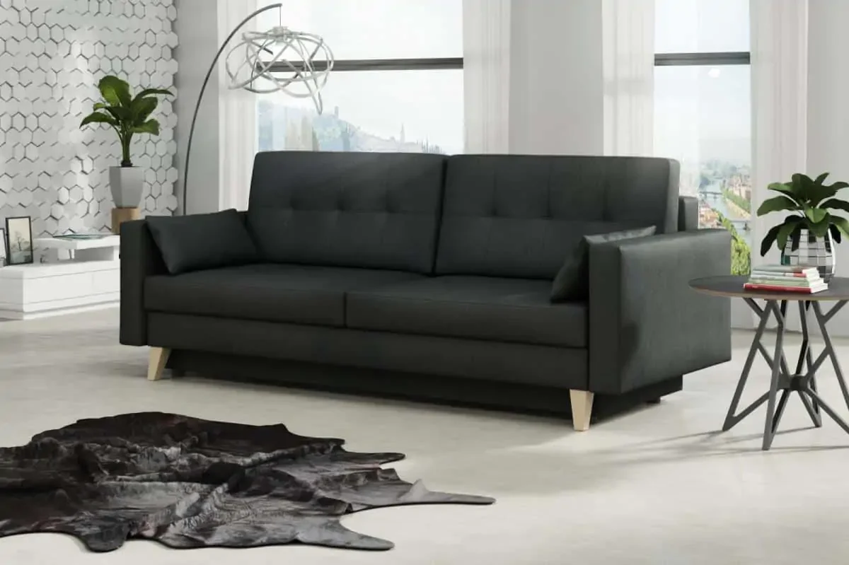 Pohovka Mariana Kronos 34 přináší do interiéru elegantní retro šarm. Zešikmené dřevěné nohy a látkové knoflíky na opěrce podtrhují tradiční vzhled a dodávají charakter. Jedná se o rozkládací model s praktickým úložným prostorem, který skryje lůžkoviny i drobnosti. Díky automatickému rozkládacímu mechanismu snadno rozložíte na prostorné lůžko pro občasné spaní hostů. Sedák vzniká z kombinace vlnité pružiny, bonellových pružin a kvalitní PUR pěny, což zajišťuje pohodlí při sezení i spaní. Pohovka je plně čalouněná a díky tomu ji lze umístit volně v prostoru - hodí se do obývacího pokoje, pracovny i hostinského pokoje. Ilustrační doplňky na fotografiích nejsou součástí ceny.