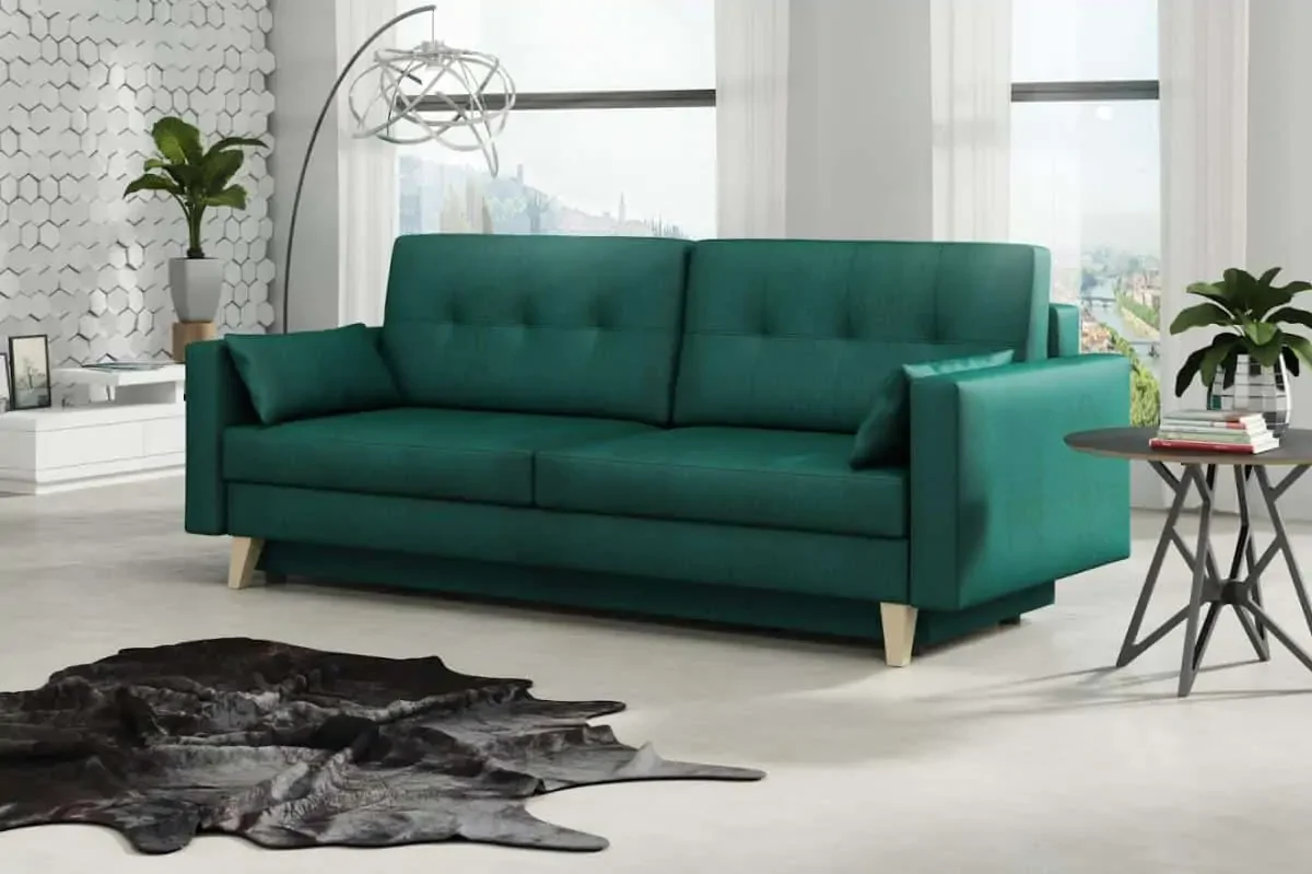 Při jednoduchém rozložení vznikne prostorné lůžko pro občasné spaní hostů. Sedák je vyplněn kombinací vlnitých a bonellových pružin a kvalitní PUR pěnou, což zajišťuje pohodlí i dlouhodobou odolnost. Pohovka je celočalouněná, takže ji lze umístit i volně do prostoru a lépe tak sladíte s barevným interiérem. Dlouhá životnost a snadná údržba potahu jsou dalšími přednostmi tohoto kousku. Výborně se hodí do obývacího pokoje, pracovny či pokoje pro hosty. Zelená barva dodá interiéru svěží akcent a skvěle ladí s různými styly i textiliemi.