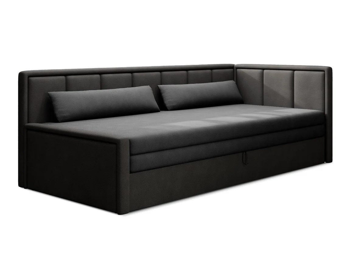 Elegantní rozkládací pohovka s pravým provedením a dvoubarevným čalouněním v šedé a černé látce. Provedení: pravé, potahová látka Poco 4 (šedá) a Poco 10 (černá) pro variabilní vzhled.