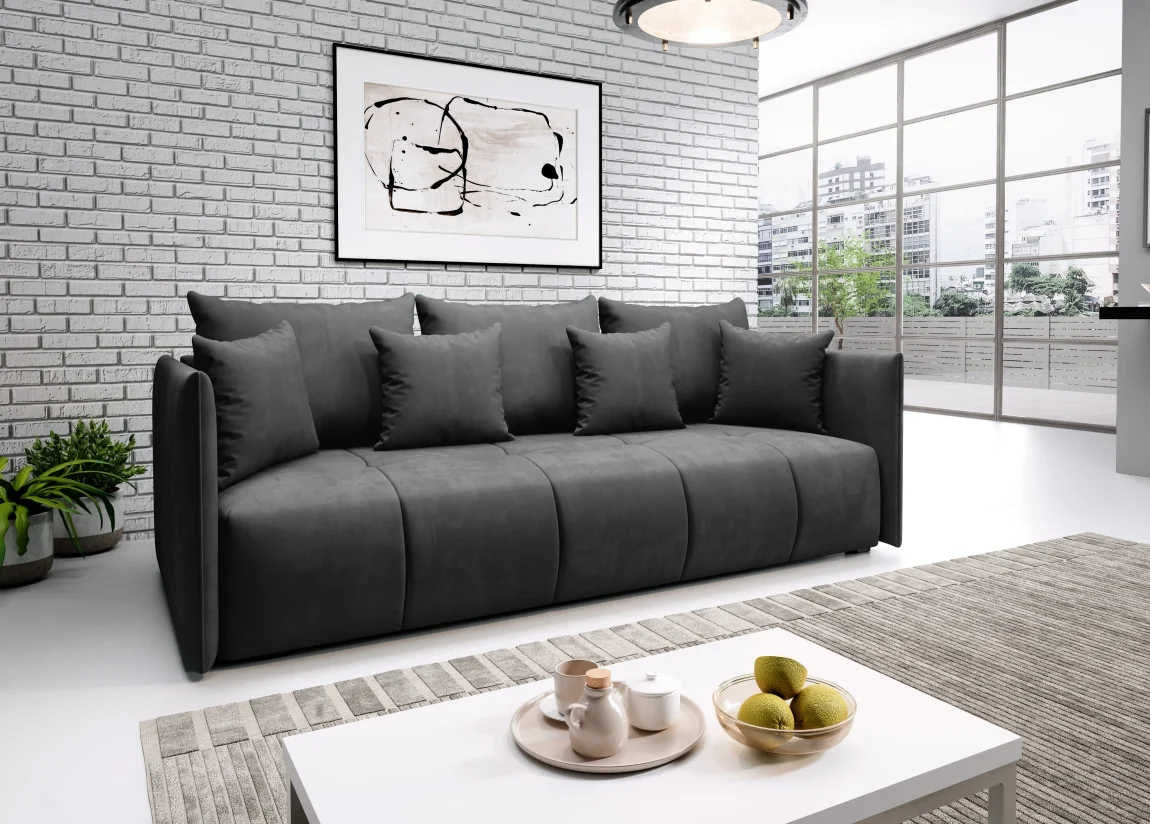 Rozkládací pohovka PURDY v provedení černošedé látky Monolith 95 spojuje elegantní vzhled s praktičností pro každodenní použití. Součástí jsou polštáře se zapínáním na zip a prostorný úložný prostor pro ložní prádlo či doplňky.