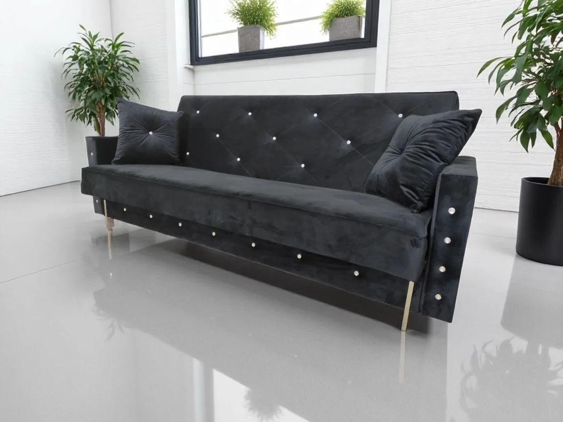 Rozkládací pohovka s praktickým úložným prostorem poskytuje pohodlné místo na odpočinek pro hosty i každodenní sezení. Černá látka působí elegantně a snadno se udržuje. Rozměry pohovky činí 216 x 98 x 90 cm, sedací plocha má šířku 195 cm a výšku sedu 49/53 cm, hloubka sedu dosahuje 60 cm.