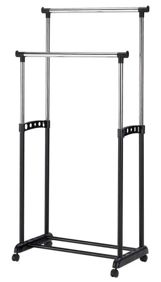 Praktický pojízdný věšák na oděvy, který se hodí do předsíně i do ložnice a díky kolečkům je manipulace snadná. Jeho kovová konstrukce v kombinaci s chromovanou povrchovou úpravou a černou barvou dodává moderní vzhled a zaručuje dlouhou životnost.