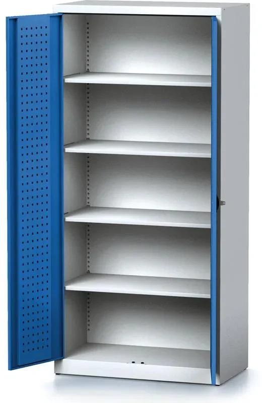 Interiér dveří je vybaven perforací EUROPERFO pro snadnou instalaci držáků nářadí a horní část zadní stěny umožňuje instalaci dodatečného závěsného systému. Dveře s masivními čepy se otevřou až do 110°, což usnadňuje přístup. Bezpečnost zajišťuje tříbodový cylindrický zámek s klíči. Přestavitelné police s nosností 80 kg jsou snadno nastavitelné po 25 mm, zatímco zásuvky s vnitřním rozměrem 780 x 380 mm a nosností 40 kg jsou vybaveny 100% výsuvem pro komfortní používání. Do zásuvek lze vložit děliče pro lepší organizaci. Povrch je upraven práškovým vypalovacím lakem, který odolává opotřebení. Skříň je dostupná v několika barevných variantách dveří, například ve šedé, antracitové, modré či červené, což umožňuje sladění s vaším dílenským prostředím. Tento robustní a funkční úložný systém je ideální volbou pro profesionální dílny nebo kutily, kteří oceňují kvalitu a přehlednost.