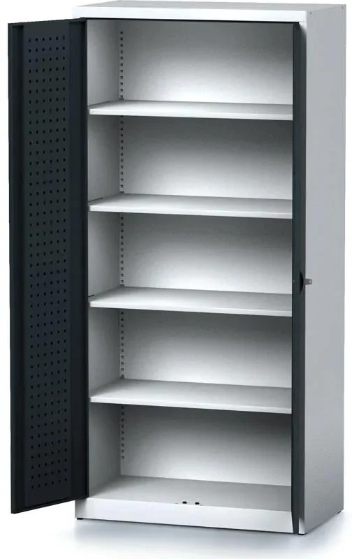 Vnitřní strana dveří je vybavena perforací EUROPERFO, umožňující instalaci držáků na nářadí, což zvyšuje přehlednost a dostupnost. Horní část zadní stěny je osazena závěsným systémem EUROPERFO, který nabízí další možnosti uspořádání. Masivní dveře s úhlem otevření 110° jsou zabezpečeny tříbodovým cylindrickým zámkem s otočnou rukojetí a dvěma klíči. Policové police s nosností 80 kg jsou nastavitelné po 25 mm, zatímco zásuvky s vnitřními rozměry 780x380 mm a nosností 40 kg poskytují snadný přístup díky 100% výsuvu a je možné je doplnit děliči pro lepší organizaci. Povrchová úprava v šedé barvě (RAL 7035) je provedena práškovým vypalovacím lakem, což zaručuje odolnost a dlouhou životnost. K dispozici je také výběr barevných variant dveří, včetně šedé, antracitové, modré nebo červené, díky čemuž si skříň snadno přizpůsobíte svému pracovním prostředí. Tento robustní a praktický kousek je doporučen pro každou dílnu či výrobní provoz, kde je potřeba spolehlivě uspořádat a zabezpečit nářadí.
