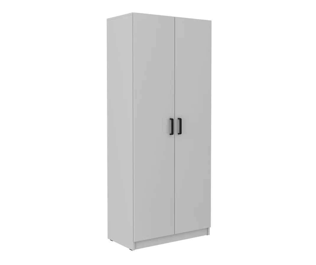 Policová skříň AGEPSTA 2D v světle šedé barvě je praktickým řešením pro pořádek v kanceláři i doma. Rozměry: šířka 79,9 cm, výška 190,1 cm a hloubka 43,6 cm. Korpus je z laminovaného lamina o tloušťce 18 mm s PVC hranou 1 mm a dvířka z lamina o tloušťce 16 mm s identickou PVC hranou; úchyty jsou kovové.