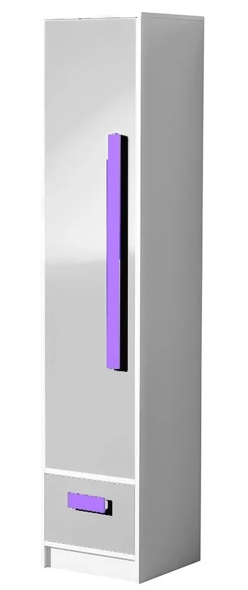 Policová skříň BLOURT představuje úzkou policovou skříň ze sektorové řady s bílým leskem dveří a fialovými úchyty, která zaujme netradičním barevným zpracováním. Vyrobena je z kvalitní LTD desky s ABS hranami pro dlouhou životnost a snadnou údržbu, korpus je v bílém matu, dveře v bílé lesklé úpravě.