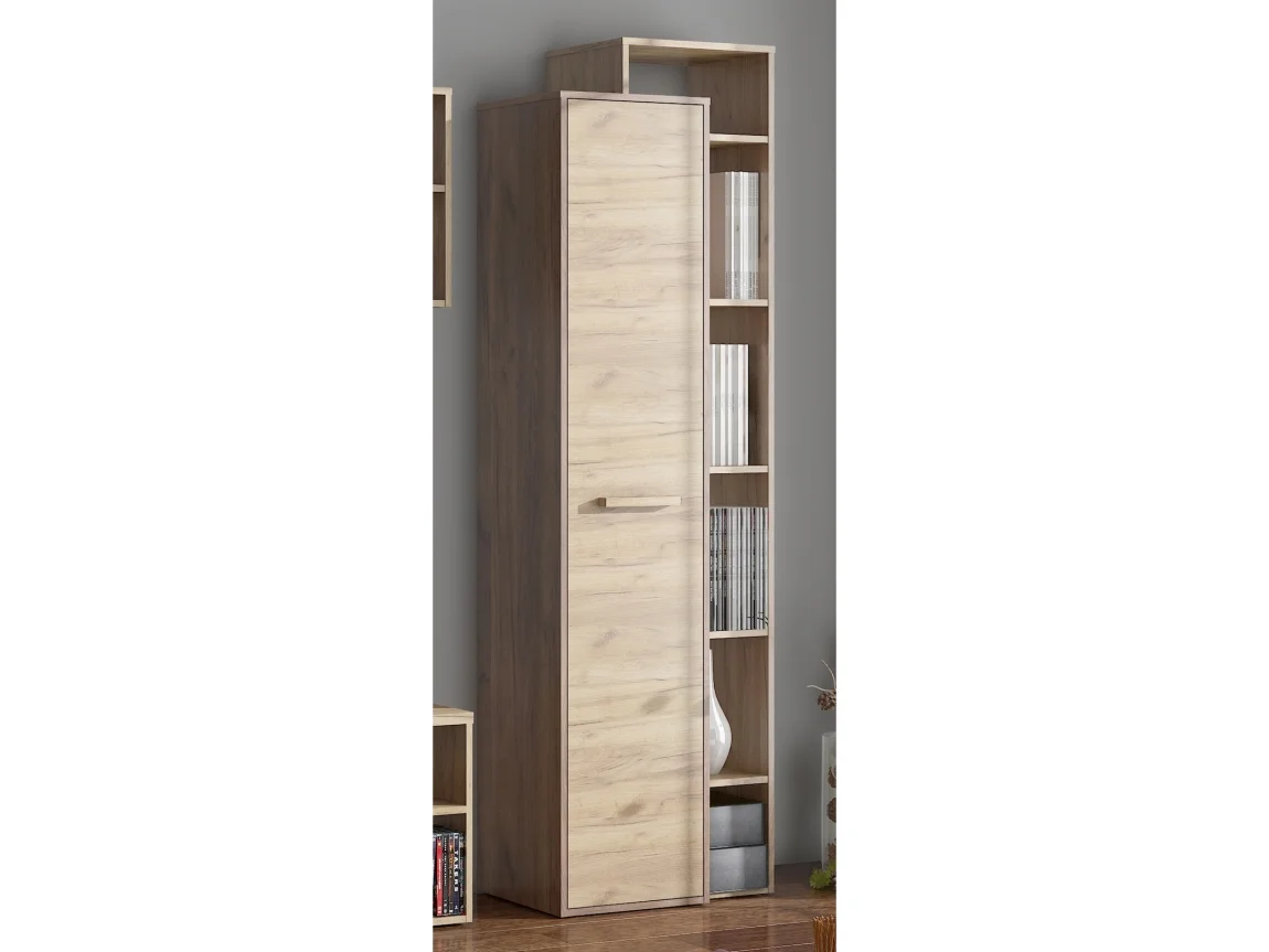 Policová skříň DORINDA v pravém provedení kombinuje barvy craft tobaco a craft zlatý pro elegantní vzhled. Rozměry 64 × 203 × 41 cm, vyrobena z LTD s ABS hranami pro pevnost a snadné čištění.
