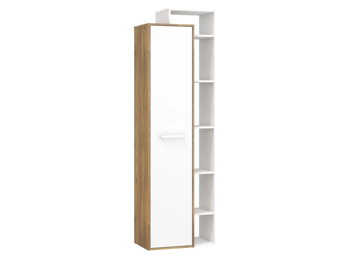 Policová skříň DORINDA v kombinaci dub burgundský a bílá má pravé otevírání dveří, což usnadňuje přístup k uloženým věcem. Rozměry 64 × 203 × 41 cm zajišťují dostatek místa pro dokumenty a drobnosti a zároveň nezabírají příliš prostoru.