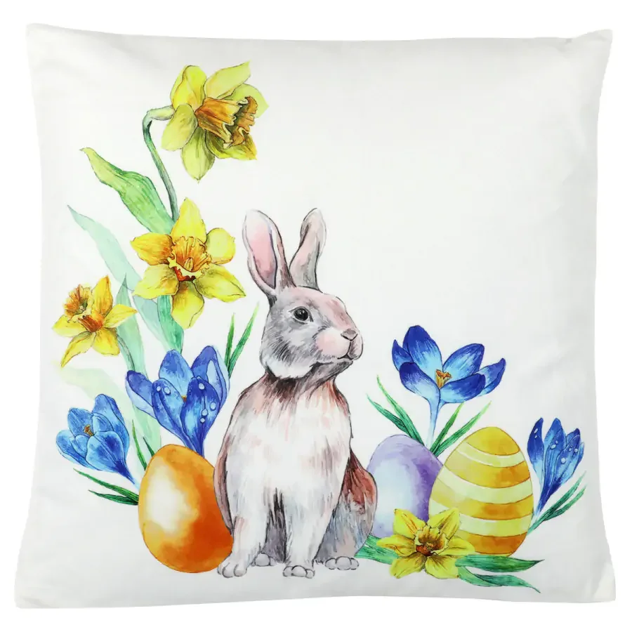 Polštář UBR087-1 se pyšní jemným sametovým povrchem, který se příjemně dotýká a dodává interiéru luxusní vzhled. Na bílé ploše se objevují roztomilý zajíček, barevná vajíčka a jarní květiny, což tvoří stylovou Velikonoční dekoraci.