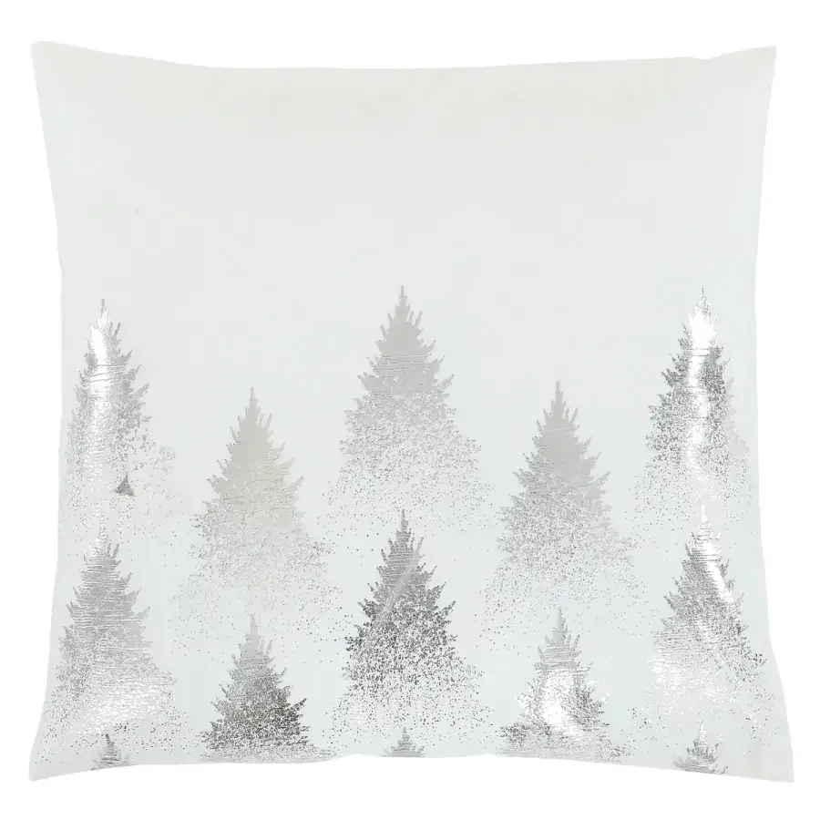 Dodejte interiéru zimní eleganci s sametovým povrchem polštáře UBR108-1 ve šedo-bílém provedení se stříbrným vánočním vzorem. Vzor zobrazuje náznaky špiček jehličnanů, které dodávají prostoru kouzlo zasněžené zimní krajiny.