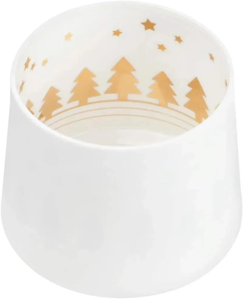 Elegantní bílý svícen z kvalitního porcelánu s jemnými zlatými akcenty přinese do vašeho domova kouzlo severské vánoční atmosféry. S průměrem 7,5 cm a výškou 6,5 cm je ideální pro zdobení stolů či komor.