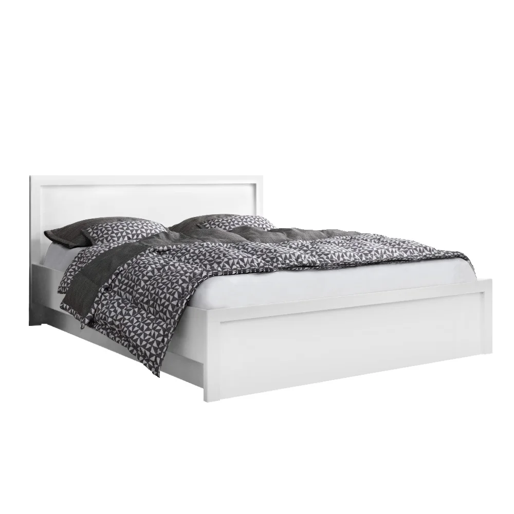 Postel z DTD laminované desky v bílé barvě kombinuje odolnost s moderním vzhledem. Celkové rozměry jsou 147,3 cm na šířku, 206,9 cm na výšku a 89,5 cm do hloubky, tloušťka materiálu dosahuje 1,6 cm.