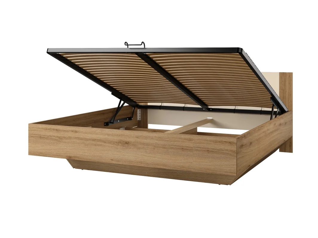 Postel s ložnou plochou 180x200 cm je vybavena výklopným roštem, který se zvedá díky plynovým pístům a umožňuje snadný přístup k úložnému prostoru pod spaním. Dekor lamina kombinuje dub divoký s béžovou, díky čemuž působí moderně a snadno ladí s dalším nábytkem.