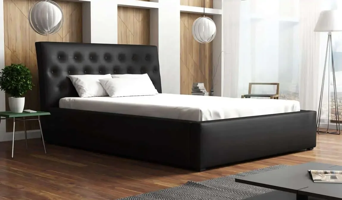 Elegantní postel s vysokým čalouněným čelem a ozdobnými knoflíky dodá ložnici šarm a styl. Její povrch je potažen ekokůží v černé barvě, která působí luxusně a snadno se udržuje. Nohy tvoří plastové prvky ve světle šedé barvě, díky čemuž působí lehce a moderně. Rošt je součástí ceny, matrace si však vyberete zvlášť ve formátu 180 x 200 cm, případně dvě matrace 90 x 200 cm. Kovový zvedací rošt lze za příplatek objednat a spolu s ním vznikne pod ložnou plochou praktický úložný prostor. Změnu roštu je nutné zadat při první objednávce; cena varianty s kovovým roštem je na vyžádání. Výška bočnice od země činí 34 cm a postel dodáváme v demontovaném stavu, což usnadňuje přepravu a montáž.