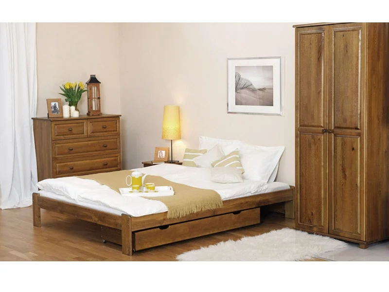 Postel BELUKHA 160x200 cm je vyrobena z masivní borovice a má povrchovou úpravu mořením v odstínu dub. Ruční barvení a následné lakování zajišťují jemný lesk a dlouhou odolnost proti opotřebení.