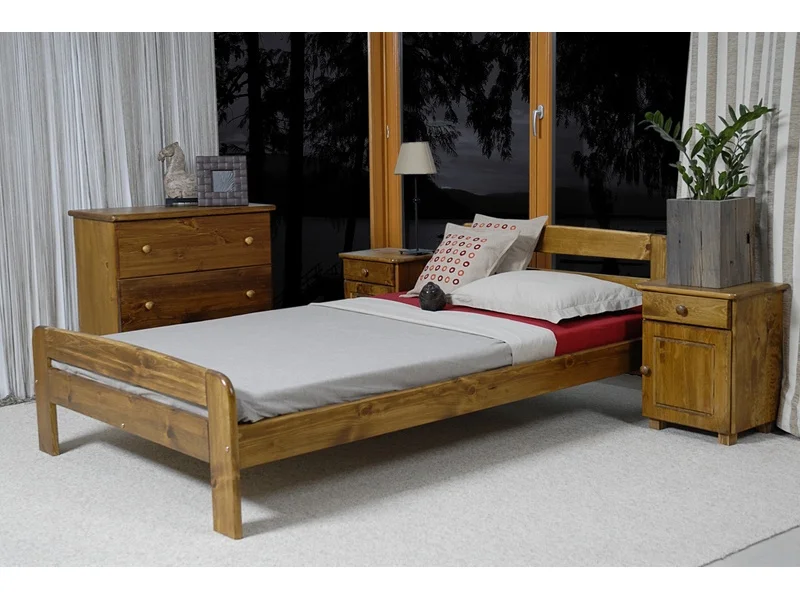 Konstrukci pevně drží výztužná deska s pátou podpěrnou nohou, která zajišťuje stabilní oporu. Rozměry: šířka 127,5 cm, délka 205,5 cm; ložná plocha 120,5 x 200,5 cm. Výška čela u hlavy: 69 cm, výška čela u nohou: 50 cm. Vzdálenost od podlahy k spodní části rámu je 20 cm, k matraci 24,5 cm a hloubka roštu po okraj postele činí 7 cm. Postel se dodává spolu s lamelovým roštem, matrace není součástí balení. Dodáváno v demontu. Záruka 24 měsíců. Dřevěná konstrukce z masivu zajišťuje pevnou stabilitu a dlouhou životnost. Přírodní vzhled borovice s dubovým odstínem se hodí do různých ložnic a dodává útulný, nadčasový vzhled.