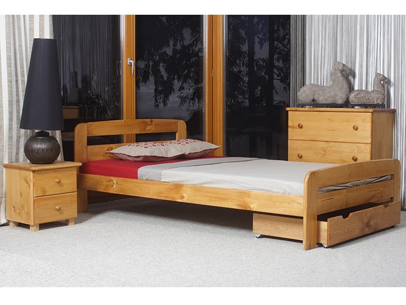 Postel CAYSON v rozměru 120x200 cm se dodává v demontu a bez matrace. Na obrázku je ilustrace – v ceně není úložný prostor. Konstrukce je vyrobená z masivu borovice s mořením do odstínu olše a povrchovou úpravou, která vznikla ručním barvením, následným lakováním a broušením pro jemný a odolný vzhled.