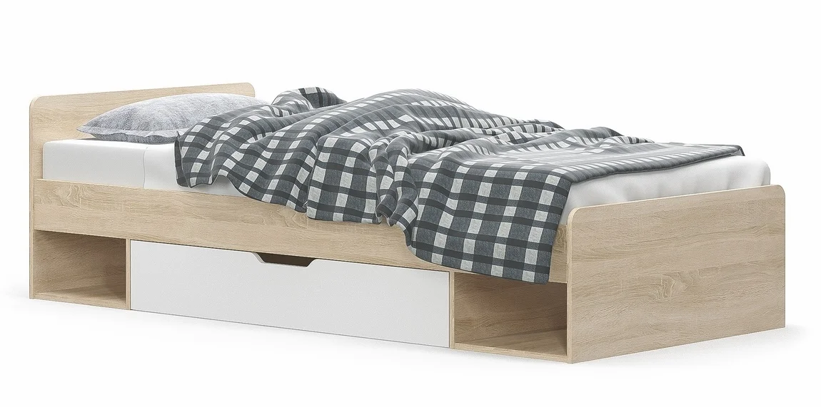 Postel CHACALTAYA se zásuvkou v provedení dub sonoma / bílá mat kombinuje moderní vzhled s praktickým úložným prostorem. Konstrukce je z kvalitní LTD desky, která zaručuje stabilitu a snadnou údržbu. Úložný prostor je ukrytý ve vestavěné zásuvce, ideální pro ložní prádlo či doplňky. Součástí balení není rošt ani matrace, proto si vyberete přesně to, co vám vyhovuje pro 90 x 200 cm spaní. Rozměry ložné plochy jsou 90 x 200 cm, celkové rozměry postele pak cca 95,6 x 60 x 203,2 cm. Materiál: LTD deska (lamino). Dodáváme v demontu. Záruka 24 měsíců. Díky neutrálnímu provedení se skvěle hodí do různých ložnicových stylů a snadno ji sladíte se zbytkem nábytku, čímž vytvoříte příjemné a praktické místo pro odpočinek.