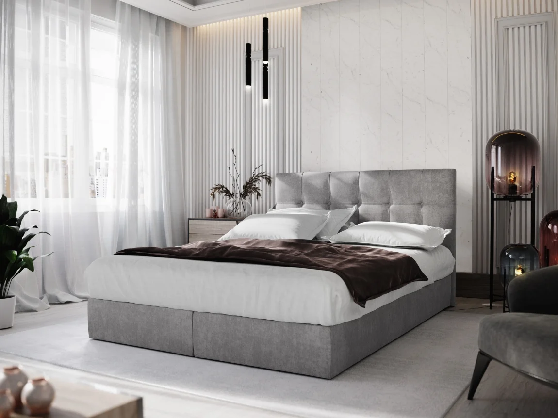 Čalouněná postel s ložnou plochou 160x200 cm je potažena látkou Cosmic 160 ve světle šedé barvě. Na čele postele vynikají knoflíky o průměru 24 mm a propracované prošití, které dodávají pohledově nadčasový vzhled.