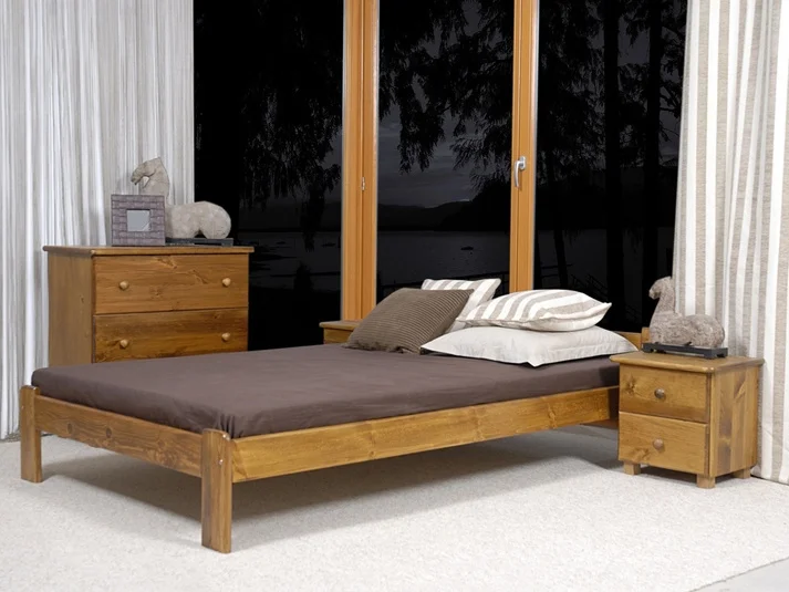 Postel MAYSON s rozměry 120 x 200 cm je vyrobena z masivní borovice a povrchově ošetřena mořením v odstínu dub. Ruční úprava zahrnuje barvení, následné lakování a jemné broušení pro hladký a odolný vzhled.