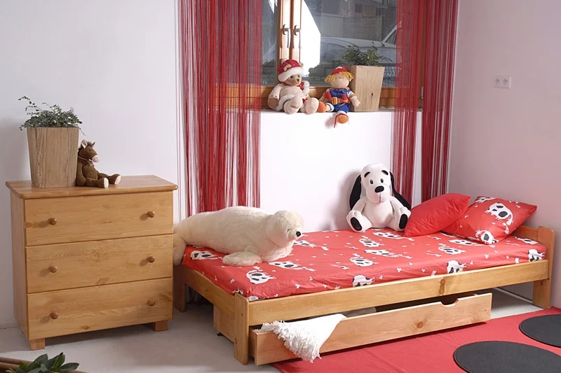 Postel MAYSON 90x200 cm je vyrobená z masivní borovice a mořená do odstínu olše. Obrázek je ilustrační – v ceně postele není úložný prostor. Tloušťka korpusu činí 2,6 cm a povrch je ručně barvený, následně lakovaný, broušený a znovu lakovaný pro dlouhou životnost.