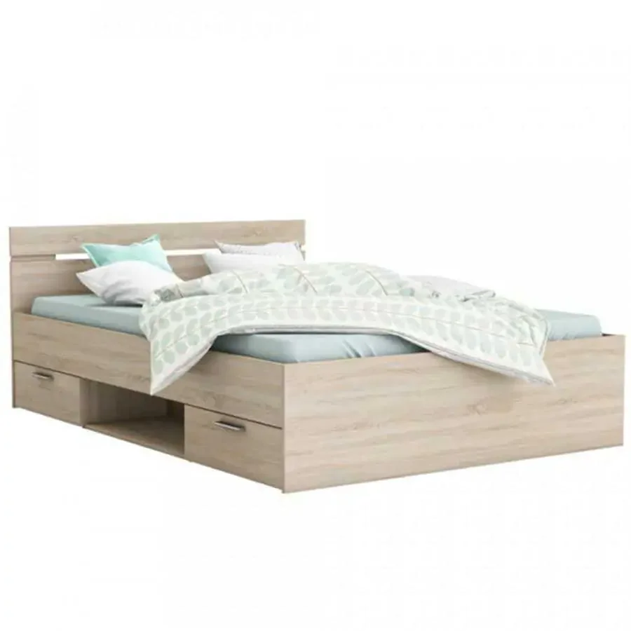 Pod rámem se skrývají dva šuplíky, které lze snadno umístit na pravou i levou stranu a slouží jako úložný prostor pro peřiny, deky či hračky, čímž šetří místo ve skříni. Pevný a odolný materiál z laminované DTD v provedení dub sonoma dodává interiéru teplý a nadčasový nádech. Výška od podlahy po rošt činí 26 cm a nosnost postele dosahuje 110 kg, což zaručuje stabilní a bezpečné spaní. Dodáváno v demontu. Pro kompletní komfort doporučujeme dokoupit rošt 160x200 cm a matraci 160x200 cm z naší nabídky. Při umísťování zvažte orientaci šuplíků tak, aby co nejlépe vyvažovaly prostor v ložnici.