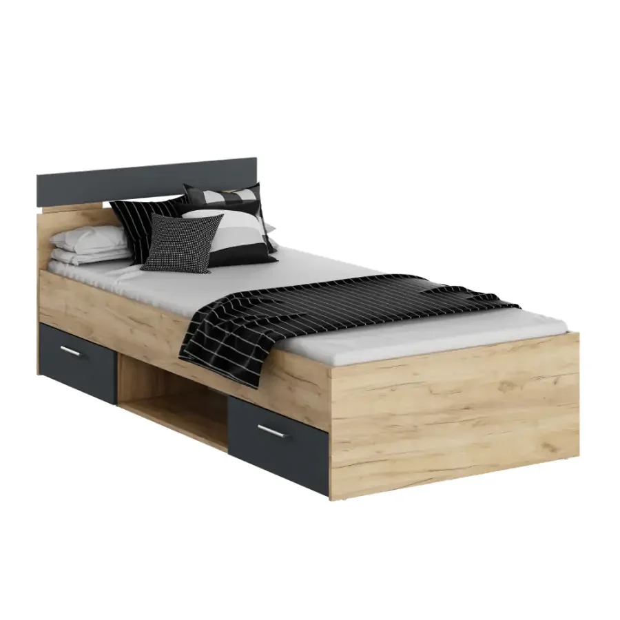 Postel MICHIGAN NEW 90x200 v dekoru dub artisan/grafit spojuje styl s praktickým úložným prostorem díky vestavěným šuplíkům. S rozměry ŠxHxV 94,5x205,2x75 cm nabídne pevný podklad pro kvalitní spánek, přičemž výška spaní činí 40 cm a výška po rošt 26 cm. DTD laminovaná konstrukce v odolném provedení zaručuje dlouhou životnost a snadnou údržbu; šuplíky lze montovat na pravou i levou stranu. Vnitřní rozměry šuplíku jsou 55,5x33,5x11 cm, takže do nich uložíte peřiny, hračky i další drobnosti bez zbytečného zabírání místa ve skříni. Nosnost postele je 100 kg. Dodáváno v demontu. Doporučujeme k ní zakoupit rošt v rámu 90x200 cm a matraci 90x200 cm z naší nabídky pro plné pohodlí. Postel je vhodná do ložnic, ale i do studentských a dětských pokojů, kde poskytne stabilní základ a stylový vzhled.