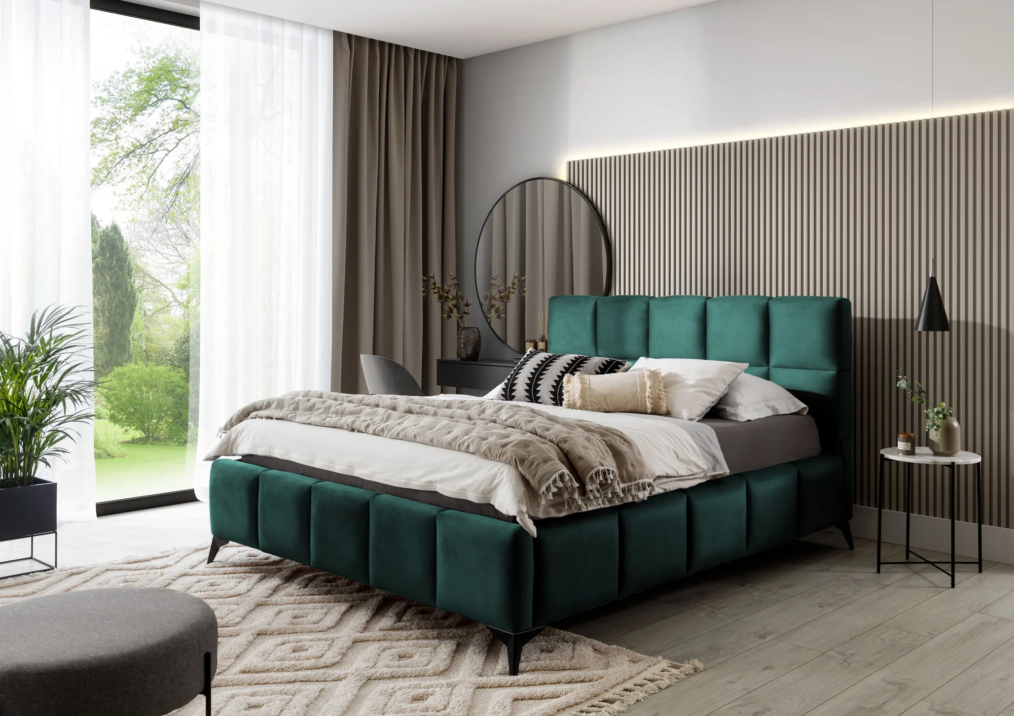 Postel Mist spojuje současný design s prvky glamour a do ložnice vnáší jemnou eleganci. Čelo postele je čalouněné měkkou pěnou a potažené kvalitním materiálem; prošívání dodává posteli charakter a současně podtrhuje moderní atmosféru.
